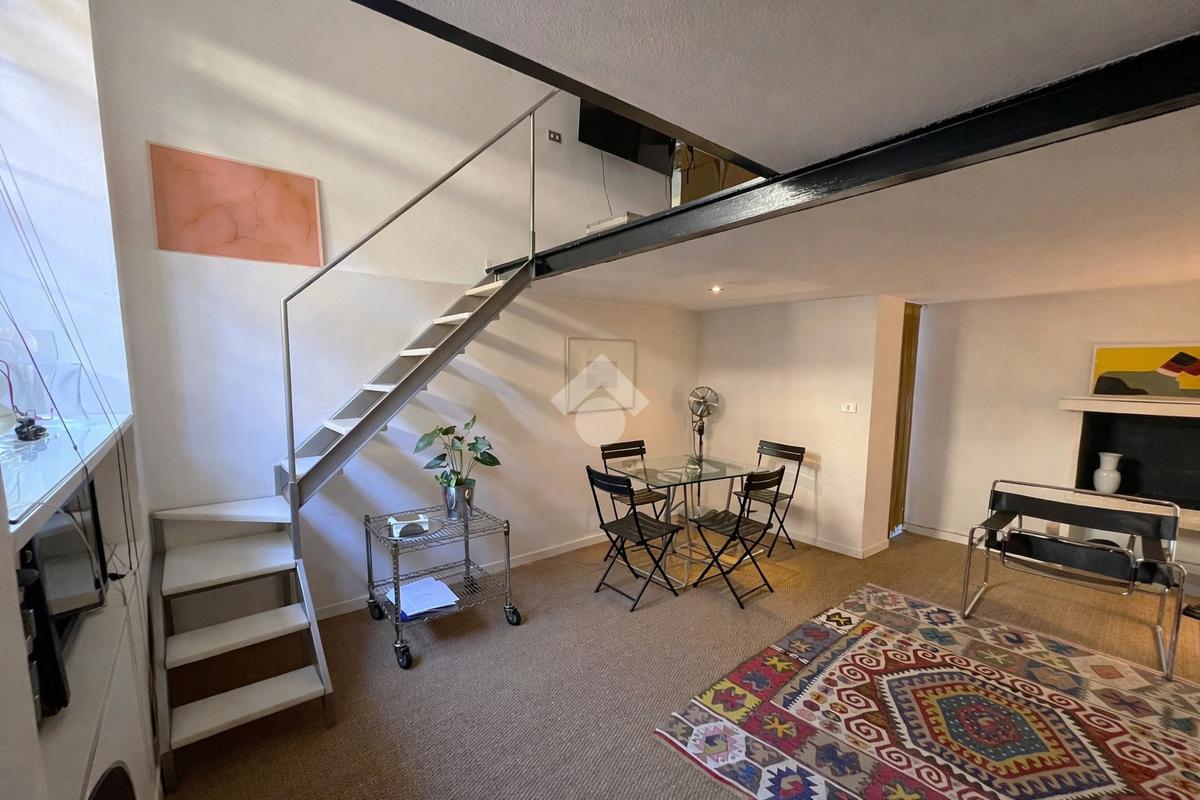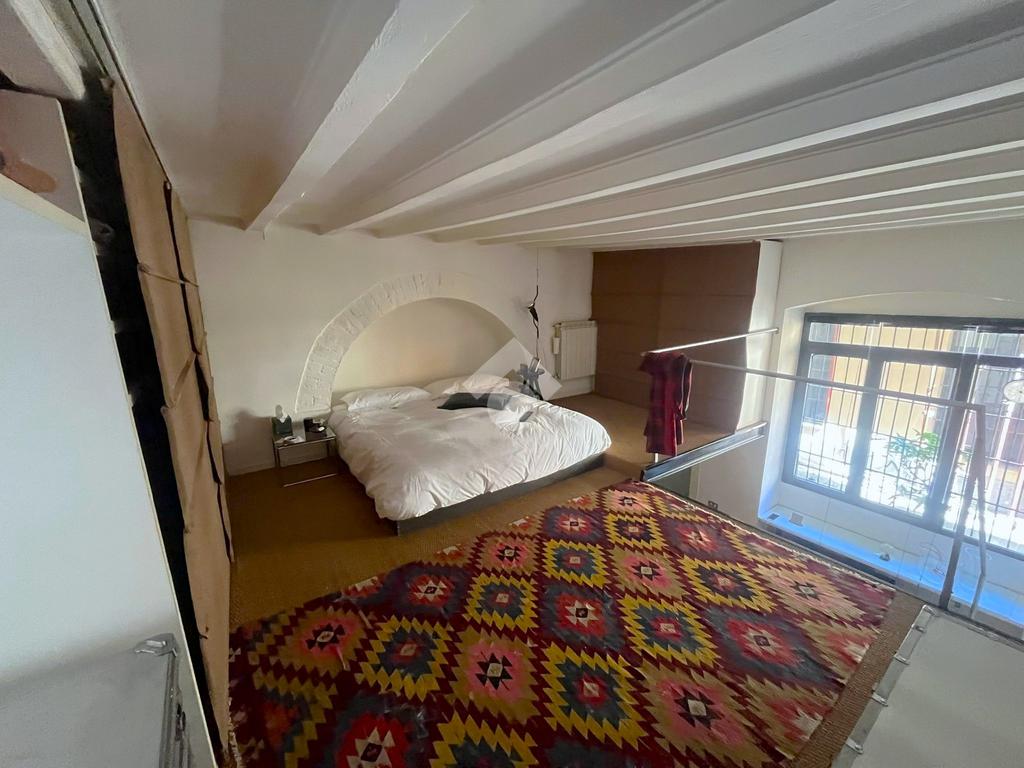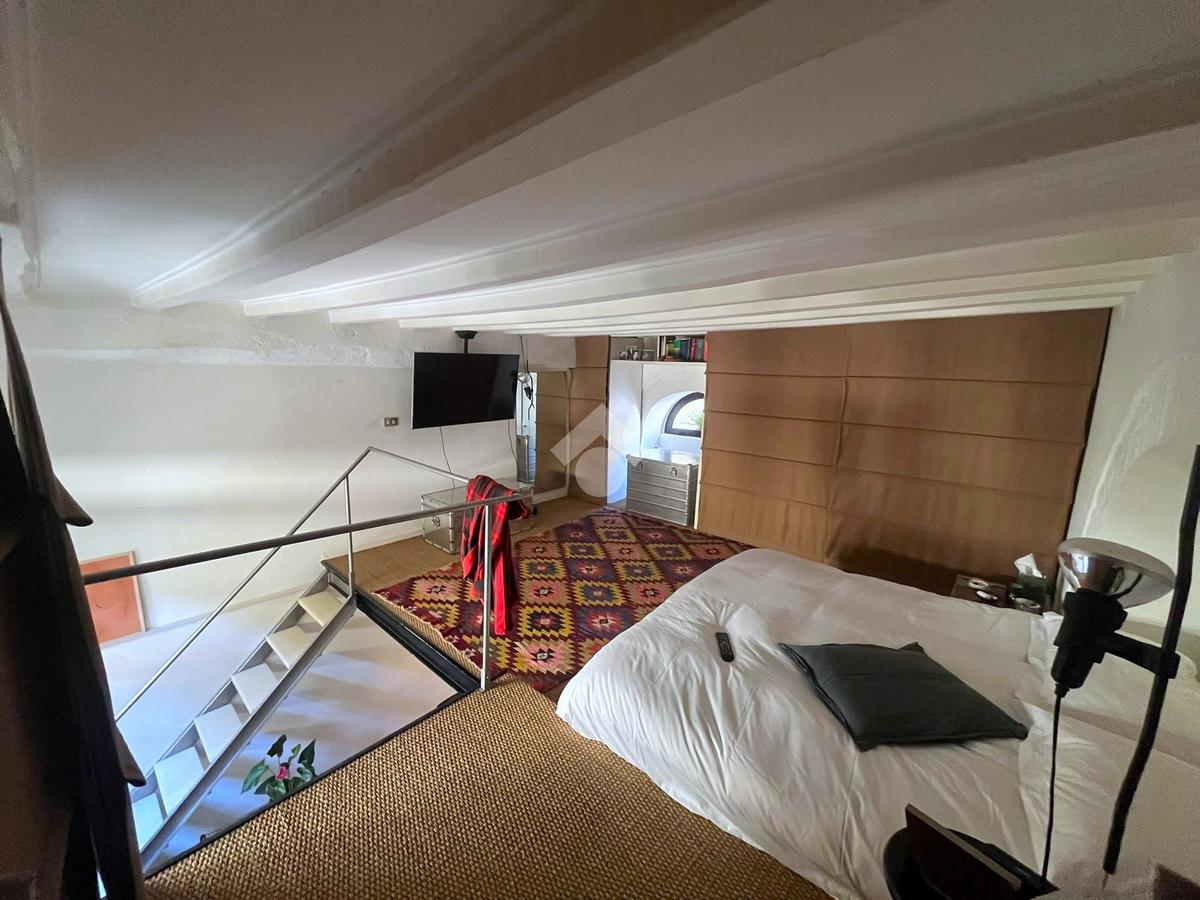 La zona notte si trova sul suggestivo soppalco, un ambiente intimo e raccolto arricchito da travi a vista e dettagli architettonici originali, perfetto per creare un angolo notte accogliente e riservato.